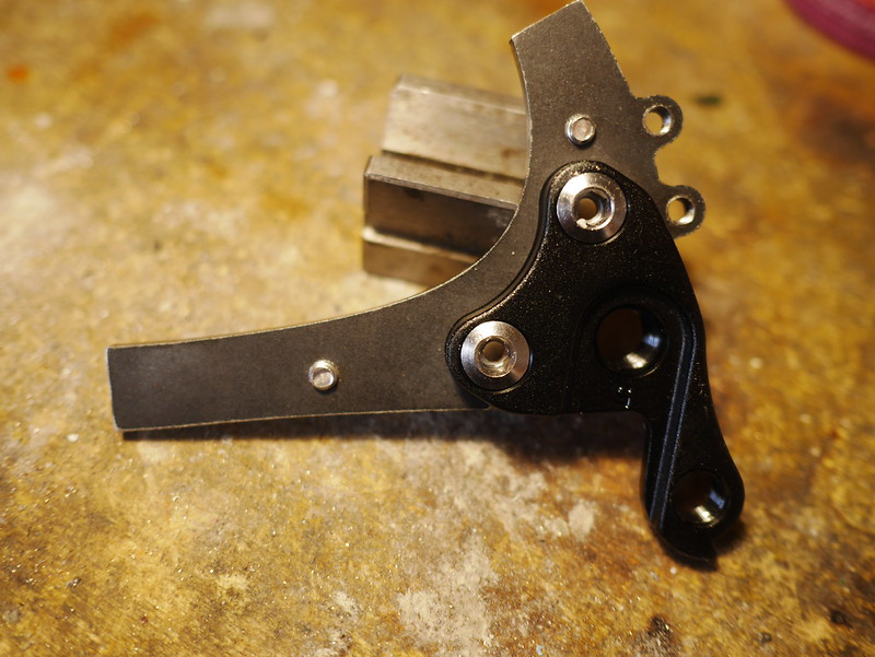 La plaque support de frein Flat-Mount est à souder ou braser sur la patte de gauche, sans forcément avoir besoin d’un gabarit, une équerre suffit pour bien vérifier la perpendicularité.